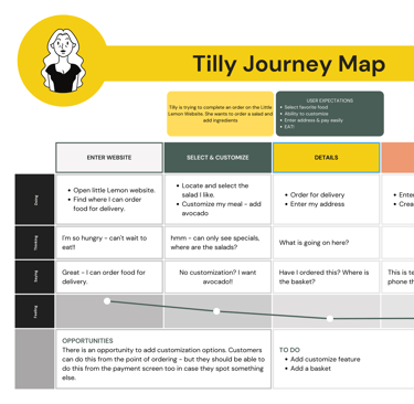 The problem statement: Tilly finds it hard to place an order through little Lemon website. She finds mixed information, confusing labels and buttons.